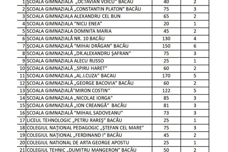 59 de clase pregătitoare reabilitate și dotate completAu fost recepționate ”la cheie” 59 de clase pregătitoare reabilitate și dotate complet în cadrul programului ”Clasa Pregătitoare” al actualei administrații locale, în cel de-al doilea an de implementare a acestuia. Clasele pregătitoare din 23 de școli, licee și colegii, din municipiul Bacău sunt dotate cu table magnetice, calculatoare, videoproiectoare și mobilier modern, bănci și scaune cu dimensiuni reglabile. "Am inițiat acest proiect în 2017 pentru copiii claselor pregătitoare, astfel încât aceștia să beneficieze de cele mai bune condiții pentru activitatea școlară fără a mai fi necesar suportul financiar al părinților", a precizat primarul municipiului Bacău, CosminNecula. În anul școlar 2017-2018, prin programul ”ClasaPregătitoare”, au fost modernizate alte 55 de clase.