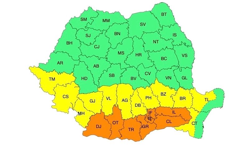 În județele Dolj, Olt, Teleorman, Giurgiu, Ilfov, în sudul județelor Vâlcea, Argeș și Dâmbovița, precum și în municipiul București, valul de căldură va fi persistent și intens, iar temperaturile vor fi deosebit de ridicate, pentru a cincea zi consecutiv. Temperaturile maxime vor fi de 38...39 de grade, iar cele minime, se vor situa în jurul a 20 de grade (noapte tropicală). Va fi caniculă și disconfort termic deosebit de accentuat, iar indicele temperatură-umezeală (ITU) va depăși pragul critic de 80 de unități.