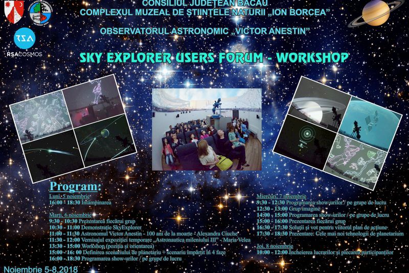 În perioada 6-8 noiembrie, Bacăul va fi capitala astronomiei naţionale. Observatorul Astronomic „Victor Anestin” din Bacău va fi gazda „Forumului Naţional al Utilizatorilor SKY Explorer”, workshop la care vor participa specialişti din şapte Planetarii din România şi Republica Moldova, precum şi specialişti ai R.S.A. Cosmos din Franţa şi România.