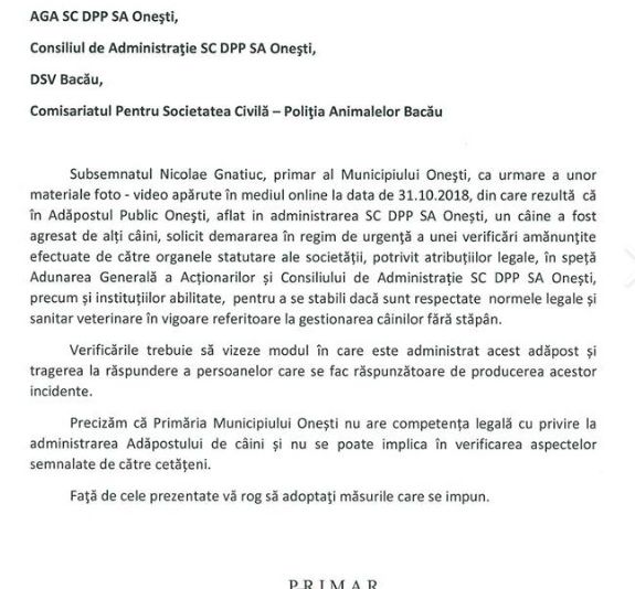 "Până acum, sesizate repetat, Poliția Română, Primăria Onești, poliția locală, ANSVSA & DSV Bacău nu au răspuns prin acțiune. De curând, primăria Onești ne-a trimis o adresă care suprimă comunicarea instituțională dintre noi. Priviți prima fotografie. E făcută în urmă cu câteva zile la adăpostul public administrat de D.P.P Onesti. Priviți restul fotografiilor. Sunt făcute recent, în același loc. Nu e vorba de întâmplări sau accidente, ci de o politică permanentă, care încalcă ticălos legislația română și pe cea europeană ale bunăstării animalelor.