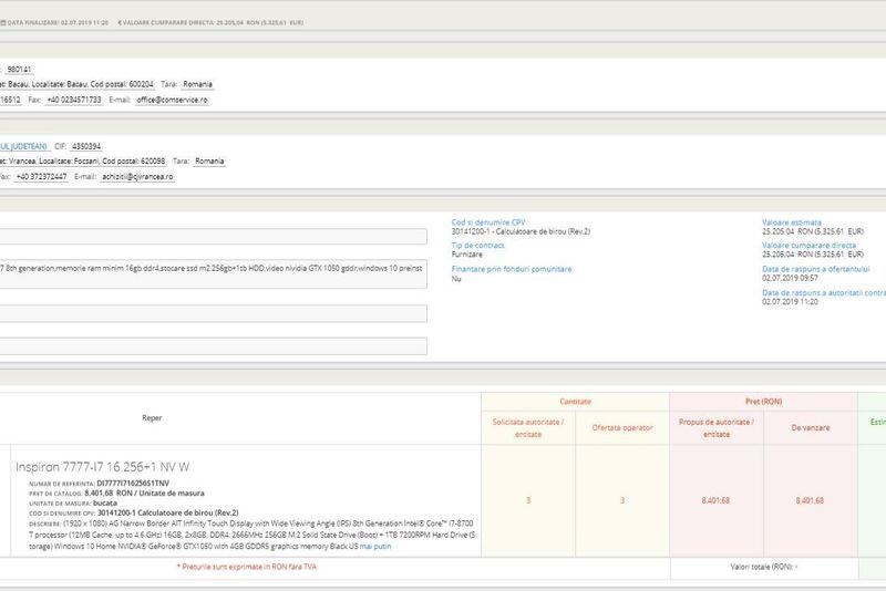 O firmă apropiată liderului PSD Bacău, Dragoș Benea, proaspăt ales europarlamentar, a dat lovitura recent, obținând un contract destul de generos cu Consiliul Județean Vrancea. Comservice Company Bacău a vândut trei super-computere instituției conduse de Marian Oprișan, un alt greu al PSD, pentru suma de peste 25.000 de lei. Achiziția s-a făcut legal, după ce anunțul CJ Vrancea a fost postat pe SEAP, iar încredințarea s-a făcut direct, fără licitație publică. Totuși, întreaga tranzacție s-a derulat rapid. Consiliul Județean din județul vecin și firma băcăuană au bătut palma la nici trei ore după ce anunțul de achiziție a fost publicat pe SEAP.Computerele sunt dintre cele mai performante existente pe piață și au următoarea configurație: „AG Narrow Border AIT Infinity Touch Display with Wide Viewing Angle (IPS) 8th Generation Intel® Core™ i7-8700T processor (12MB Cache, up to 4.6 GHz) 16GB, 2x8GB, DDR4, 2666MHz 256GB M.2 Solid State Drive (Boot) + 1TB 7200RPM Hard Drive (Storage) Windows 10 Home NVIDIA® GeForce® GTX1050 with 4GB GDDR5 graphics memory Black US“.În ultimii ani, Comservice Company Bacău a livrat calculatoare și altor instituții din Moldova, printre care Inspectoratul Școlar Iași, Universitatea de Medicină și Farmacie Iași, Primăria Onești, Direcția Silvică Botoșani sau Universitatea Dunărea de Jos Galați. b