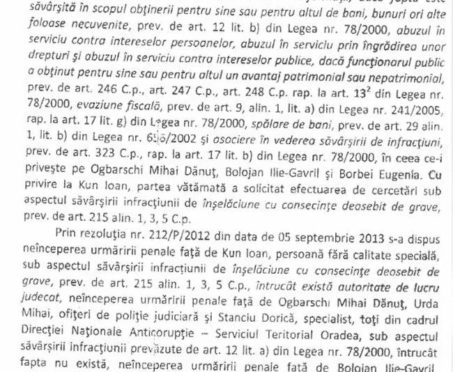 „Se va dispune clasarea față de Bolojan Ilie-Gavril și Borbei Eugenia, director executiv la Direcția Juridică din cadrul Primăriei municipiului Oradea, sub aspectul săvârșirii infracțiunii de folosire, în orice mod, direct sau indirect, de informații ce nu sunt destinate publicității ori permiterea accesului unor persoane neautorizate la aceste informații [...] întrucât fapta nu există.”, se mai arată în documentul procurorilor. (Sursa: Ordonanța de clasare din 2 martie 2016).