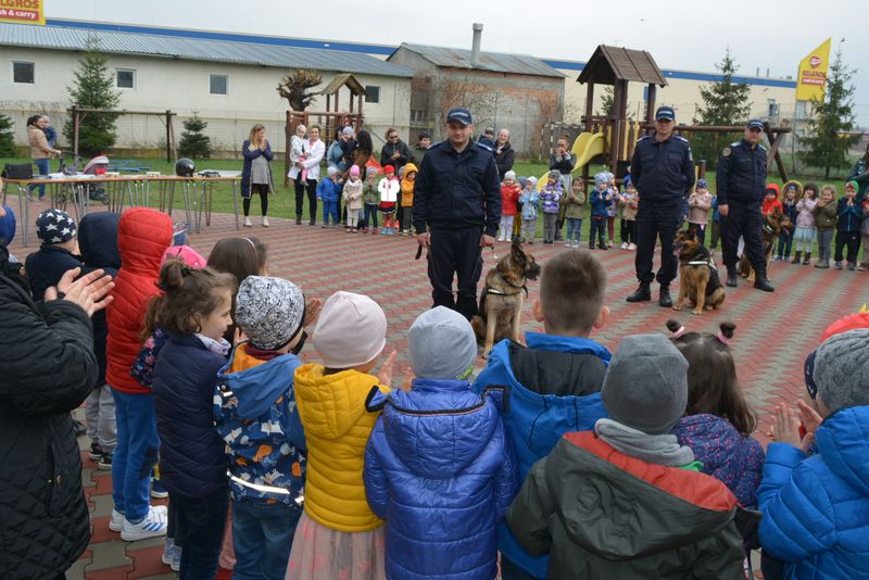 FOTO: Jandarmi în patru labe. Cum au reușit câinii Jandarmeriei Bacău să ajungă la inimile unor prichindei de grădiniță
