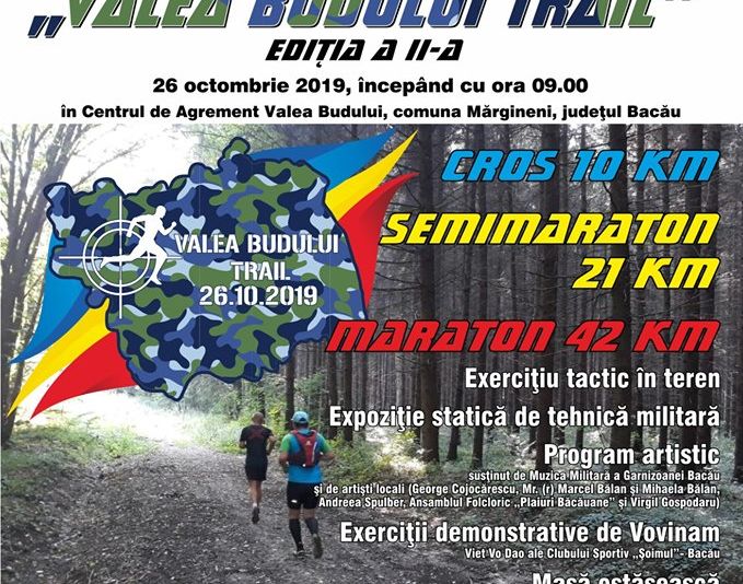 Aproape 600 de concurenți sunt așteptați să ia startul sâmbătă la ,,Valea Budului Trail” (cros, maraton şi semimaraton) ce se va desfășura la Centrul de Agrement Valea Budului din comuna Mărgineni. Manifestarea, aflată la cea de-a II-a ediție, este organizată cu prilejul Zilei Armatei României de Baza 95 Aeriană ,,Erou Căpitan Aviator Alexandru Şerbănescu”, alături de Direcţia Judeţeană pentru Sport şi Tineret Bacău, Asociația Culturală „Artă-Tradiții-Patrimoniu Fără Frontiere”, cu sprijinul Consiliului Judeţean Bacău. Organizatorii au anunțat astăzi, în cadrul unei conferințe de presă la care au participat Leonard-Gabriel Baraboi, comandantul Bazei 95 Aeriene Bacău, Sorin Brașoveanu, președintele Consiliului Județean Bacău, Georgel Cojocaru, directorul Direcției Județene de Sport și Tineret, Dorel Nistor, președintele Asociației „Artă – Tradiții – Patrimoniu Fără Frontiere”, că în acest an la ,,Valea Budului Trail” va avea loc, în premieră, și o probă de cros pentru copii, în limita a 200 de locuri. Înscrierile se vor face la start, la fața locului, la ora 12.00. Probele sunt pe categorii de vârstă: 1-3 ani- 50 m, 4-7 ani- 100 m, 8-12 ani- 200 m, 13-16 ani- 400 m. Totodată, de la ora 12.30 va funcționa tiroliana pentru copii sub 18 ani. Organizatorii au mai anunțat că accesul cu mașina se va face liber până la ora 08.30, iar după această oră Poliția Militară va permite accesul doar când traseul este liber (timpi de așteptare). După festivitatea de premiere, participanţii se vor putea bucura de un program artistic susţinut de fanfara militară şi artişti locali, precum şi de o masă ostăşească (fasole cu ciolan).