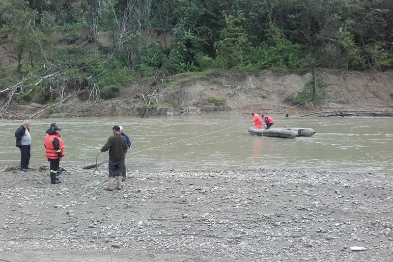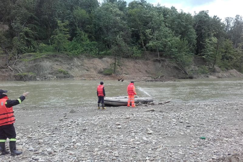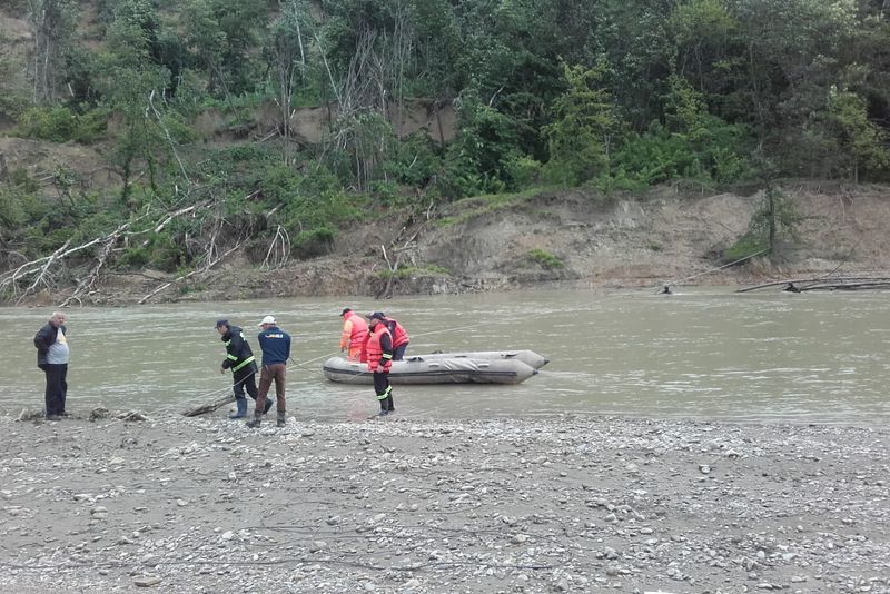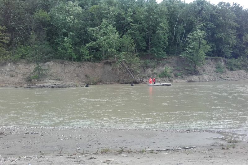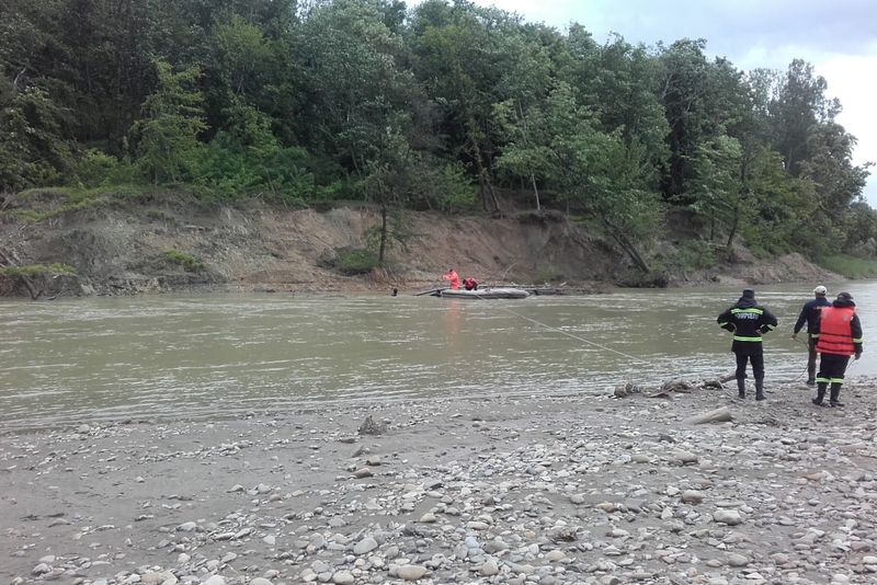 FOTO/VIDEO: Încercări disperate pentru găsirea tânărului înecat în râul Trotuș. Au fost chemați scafandrii și un tractor cu troliu
