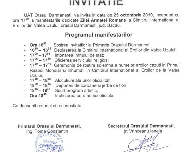 Amplă mobilizare pe rețelele de socializare, și nu numai, pentru participarea de vineri, 25 octombrie, în Cimitirul Internațional din Valea Uzului, la sărbătorirea Zilei Armatei Române. La acest eveniment vor participa membri și simpatizanți din Bacău și mai multe județe ale țării, printre care și ai Asociației Calea Neamului din Brașov, al cărei președinte este medicul Mihai Tîrnoveanu. Cel supranumit ”Sufletul Ardealului” face cunoscut programul dedicat eroilor din Valea Uzului. Astfel, cei prezenți vor aprinde pe înserat 149 de torțe si se vor ruga la lumina lor. Fiecare torță va purta numele de botez al unui militar Erou. Aceste nume vor fi pomenite la Slujba Religioasă care va avea loc cu acest prilej, la fel cum au fost pomeniți Eroii Armatei Române la Arcul de Triumf la aniversarea celor 100 de ani de la intrarea trupelor române în Budapesta și a eliberării Ungariei de comunism, în 1919. „Noi mergem pe 25 octombrie, de Ziua Armatei Române, la Valea Uzului, în Cimitirul Internațional al Eroilor, cu 150 de torțe, pentru 150 de Inimi de Eroi ce bat în piepturile noastre! (…) Toate acțiunile de până acum le-am făcut cu ajutorul vostru, avem marea nădejde că și acum ne veți fi alături, că veți fi alături de Eroii Români căzuți în luptele de la Valea Uzului al căror nume se vrea a fi șters. Prezența noastră va apăra Crucile Eroilor Români din cimitir. Datorită prezenței noastre acolo, măcar cu prilejul zilelor importante din an, nimeni nu va îndrăzni să le dărâme sau să le mute de acolo. În Războiul care a dus la Marea Unire din 1918, pe Valea Uzului au murit sute de ostași ai Armatei Române, dobândind victorii importante în apărarea trecătorilor din Carpați. Inimile lor de viteji sunt vii în piepturile noastre, inimile lor vor fi Torțele ce ard biruitoare pe întreg cuprinsul Văii Uzului. Cinstim Armata Română!”, menționează medicul brașovean pe pagina sa de socializare. Și Primăria Dărmănești a anunțat programul manifestărilor de vineri de la Valea Uzului (foto).