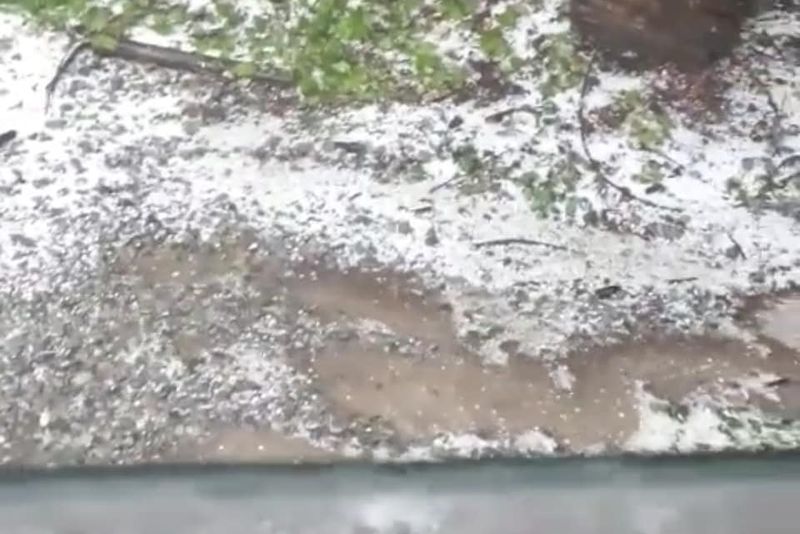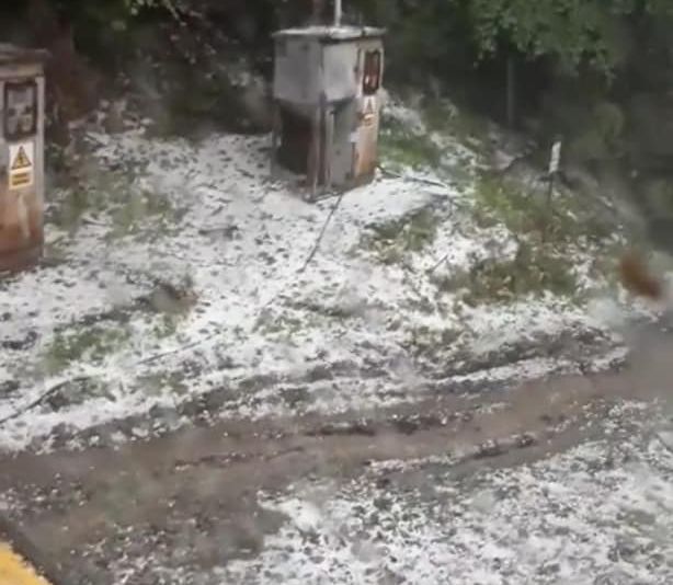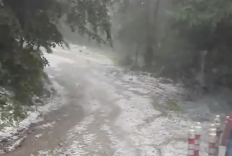 FOTO: Vreme extremă la Moinești. Soare în oraș, grindină cât oul de porumbel pe dealul din apropiere