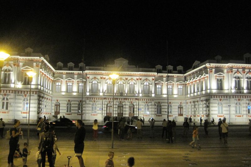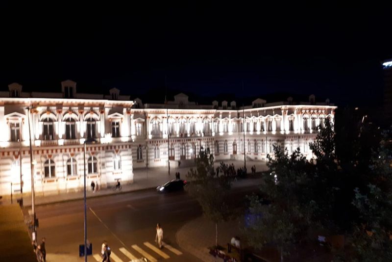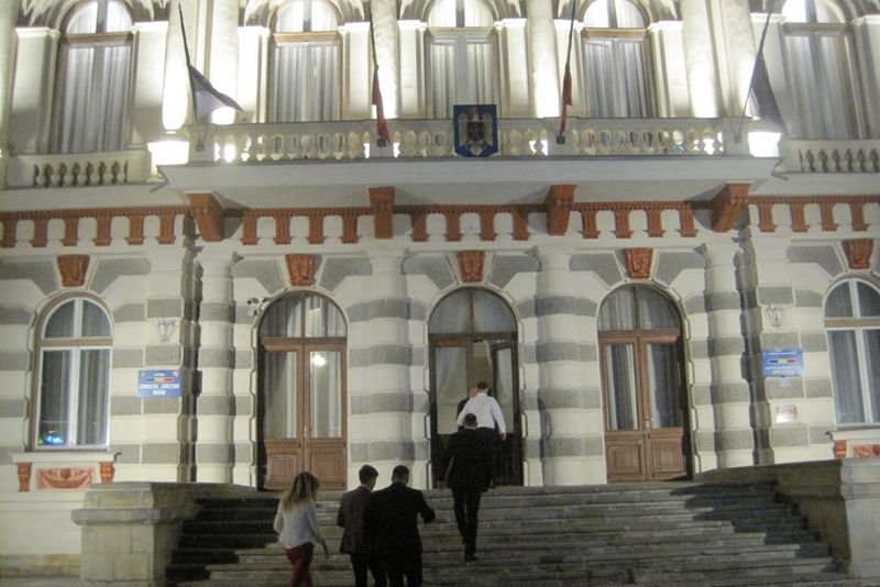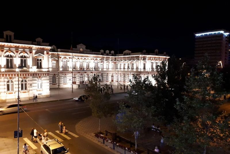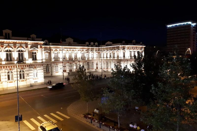 FOTO:Palatul Administrativ din Bacău, într-o lumină nouă. Aseară s-au aprins cele peste 80 de proiectoare care luminează fațada clădirii