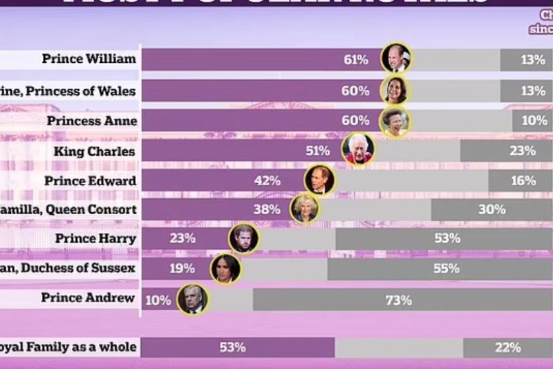 Totuși, Prințul William rămâne în continuare cel mai popular membru al familiei regale, cu o cotă de 61 la sută, în timp ce Kate și Prințesa Anne se află pe locul doi cu 60 la sută.