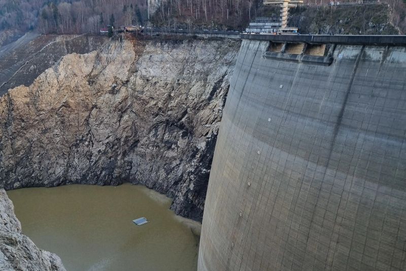 Noi imagini cu lacul Vidraru aproape gol. Nivelul apei a scăzut cu 100 de metri, peisajul este SPECTACULOS