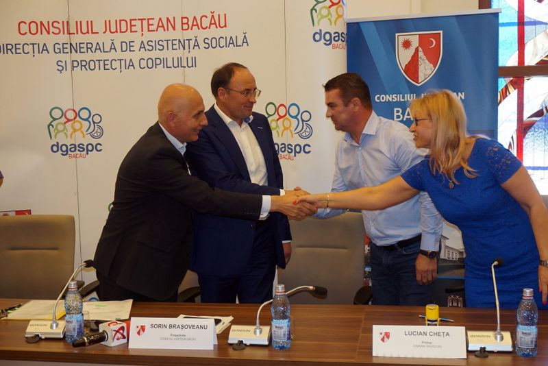 Vineri, 3 august 2018, la Sala Mare a Consiliului Judeţean Bacău a avut loc semnarea contractului de finanţare a proiectului Servicii sociale alternative pentru persoanele adulte cu dizabilităţi. Beneficiarii finanţării sunt Direcţia Generală de Asistenţă Socială şi Protecţia Copilului Bacău şi UAT Răcăciuni. Prin acest proiect va fi extinsă infrastructura de servicii sociale comunitare pentru dezinstituționalizarea persoanelor cu dizabilități din cadrul Centrului de Recuperare și Reabilitare Neuropsihiatrică Răcăciuni (CRRN). Concret, va fi înfiinţat un centru de zi cu o capacitate de 30 de locuri, în Comuna Răcăciuni, destinat persoanelor adulte cu dizabilități dezinstituționalizate din C.R.R.N. Răcăciuni și persoanelor adulte cu dizabilități din comunitate cărora, în prezent, nu li se oferă servicii prin care să se prevină instituţionalizarea. Totodată, vor fi furnizate şi servicii sociale respectând un raport de 4 locuinţe protejate (cu o capacitate de 6 beneficiari fiecare) la un centru de zi, astfel încât fiecare persoană din locuinţele protejate va beneficia de serviciile oferite în centrul de zi. În total, un număr de 24 persoane adulte cu dizabilități din CRRN Răcăciuni vor primi servicii specializate în aceste locuinţe, în termen de 29 luni de la semnarea contractului de finanţare. Investiţiile vor fi realizate în Comuna Răcăciuni în parteneriat cu UAT Răcăciuni care pune la dispozitie spațiul necesar înfiinţării centrului de zi şi terenul pentru dezvoltarea locuinţelor protejate. „Un aspect important este faptul că acest proiect se încadrează în categoriile de intervenţie prevăzute atât în Strategia de Dezvoltare Regională Nord-Est 2014-2020 cât şi în Strategia de Dezvoltare Durabilă a judeţului Bacău. Prioritatea noastră este calitatea vieții băcăuanilor, atât din comunitățile rurale cât și din cele urbane, oferindu-le servicii ce le vor permite să valorifice noi oportunități de afaceri și de locuri de muncă într-un mod durabil, asigurând calitatea acestor servicii prin utilizarea adecvată a resurselor de energie, regenerabile și neregenerabile și reducerea nivelului de poluare”, a precizat Sorin Braşoveanu, preşedintele Consiliului Judeţean Bacău, prezent la eveniment.