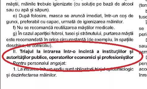 Același document prevede că pe durata stării de alertă se instituie ”obligativitatea instituţiior publice, operatorilor economici şi profesionilştilor de a organiza activitatea astfel încât să se asigure la intrarea în sediu efectuarea triajului epidemiologic şi dezinfectarea obligatorie a mâinilor”.