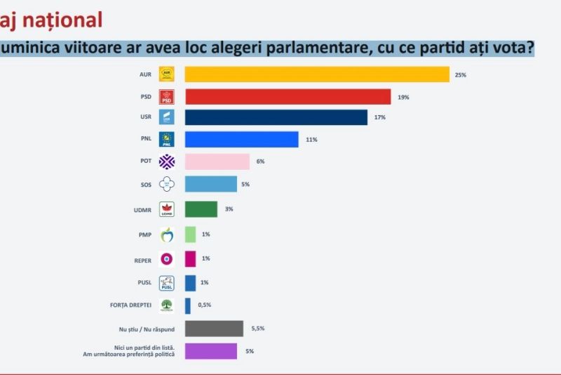 La întrebarea Dacă duminica viitoare ar avea loc alegeri parlamentare, cu ce partid ați vota?, 25% dintre cei intervievați au răspuns AUR. La mare distanță în preferințele alegătorilor se află PSD, USR și PNL.