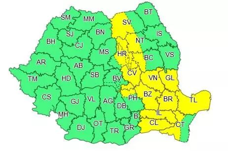 Suceava, Harghita, Covasna, Vrancea, Galați, Buzău, Brăila, Călărași, Tulcea și parțial Constanța