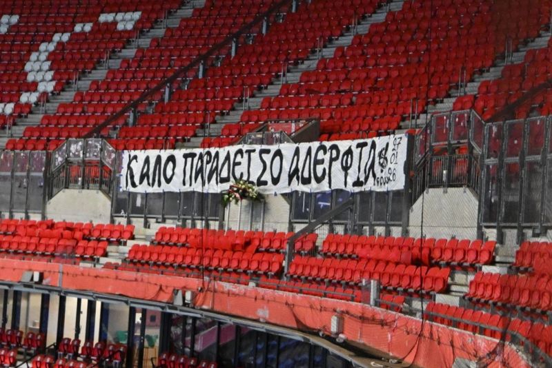 Sectorul dedicat suporterilor lui PAOK Salonic a rămas gol, însă în locul oamenilor a fost pus un banner în limba greacă pe care scria: „Drum bun în paradis, frații noștri”.